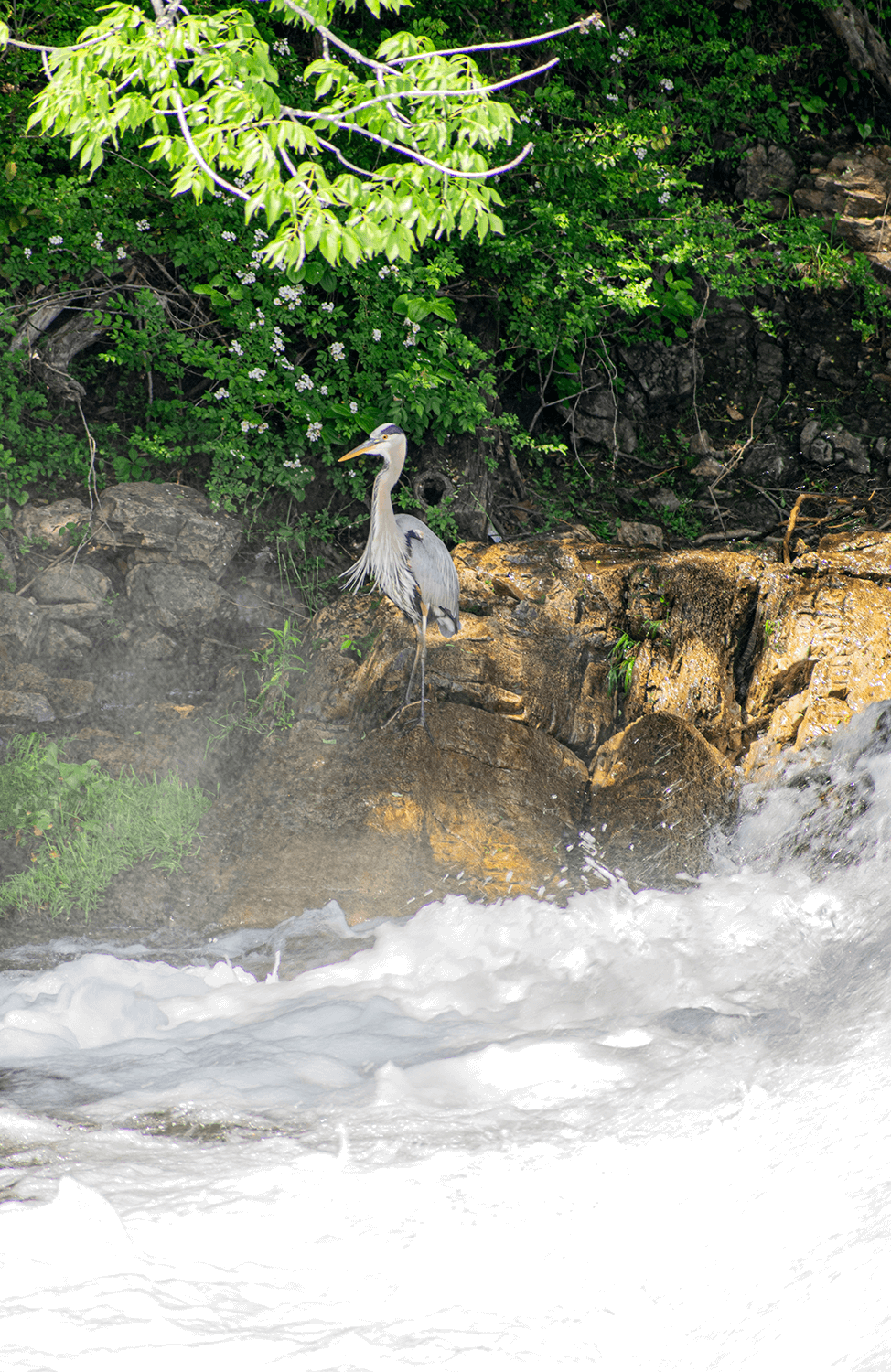 Across the falls stood a Great Blue Heron poised on a rock. The falling water made fishing easy as falling fish were easy prey. The heron picked one out of the water and flew back to enjoy his find.